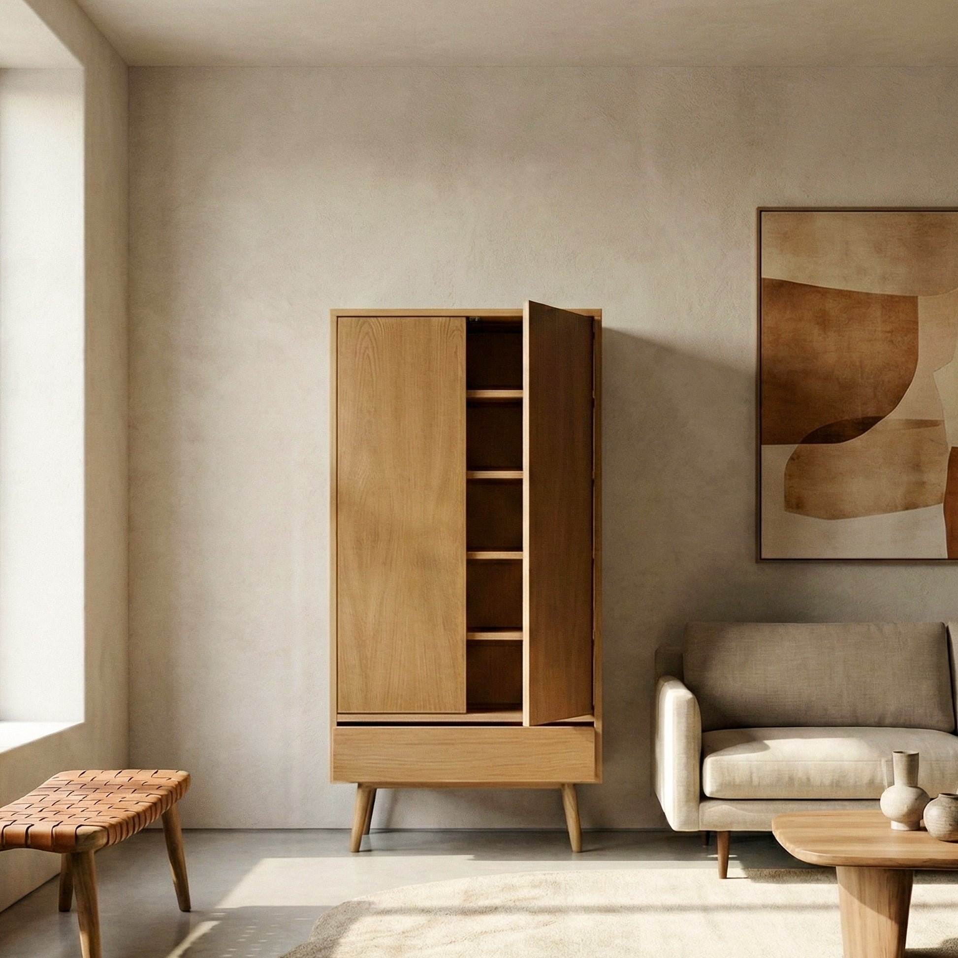 Szafa Cop Light wprowadza do wnętrza unikalny urok designu lat 50. i 60. XX wieku. Inspirowana klasyczną estetyką vintage, łączy funkcjonalne rozwiązania z eleganckim wyglądem. Przemyślane wnętrze i nowoczesne detale techniczne sprawiają, że jest stylowym i praktycznym dodatkiem do każdego wnętrza.
