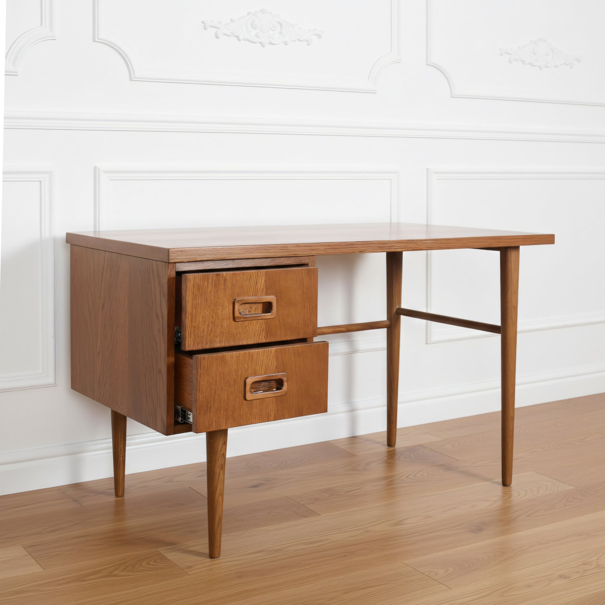 Biurko PAST to ukłon w stronę klasycznego wzornictwa, w którym liczy się harmonia proporcji, naturalne materiały i przemyślana funkcjonalność. Szeroki, solidny blat oferuje wygodną przestrzeń do pracy, pisania czy tworzenia, a dwie głębokie szuflady pozwalają uporządkować wszystkie najważniejsze drobiazgi – od notesów, po akcesoria, które chcesz mieć zawsze pod ręką.