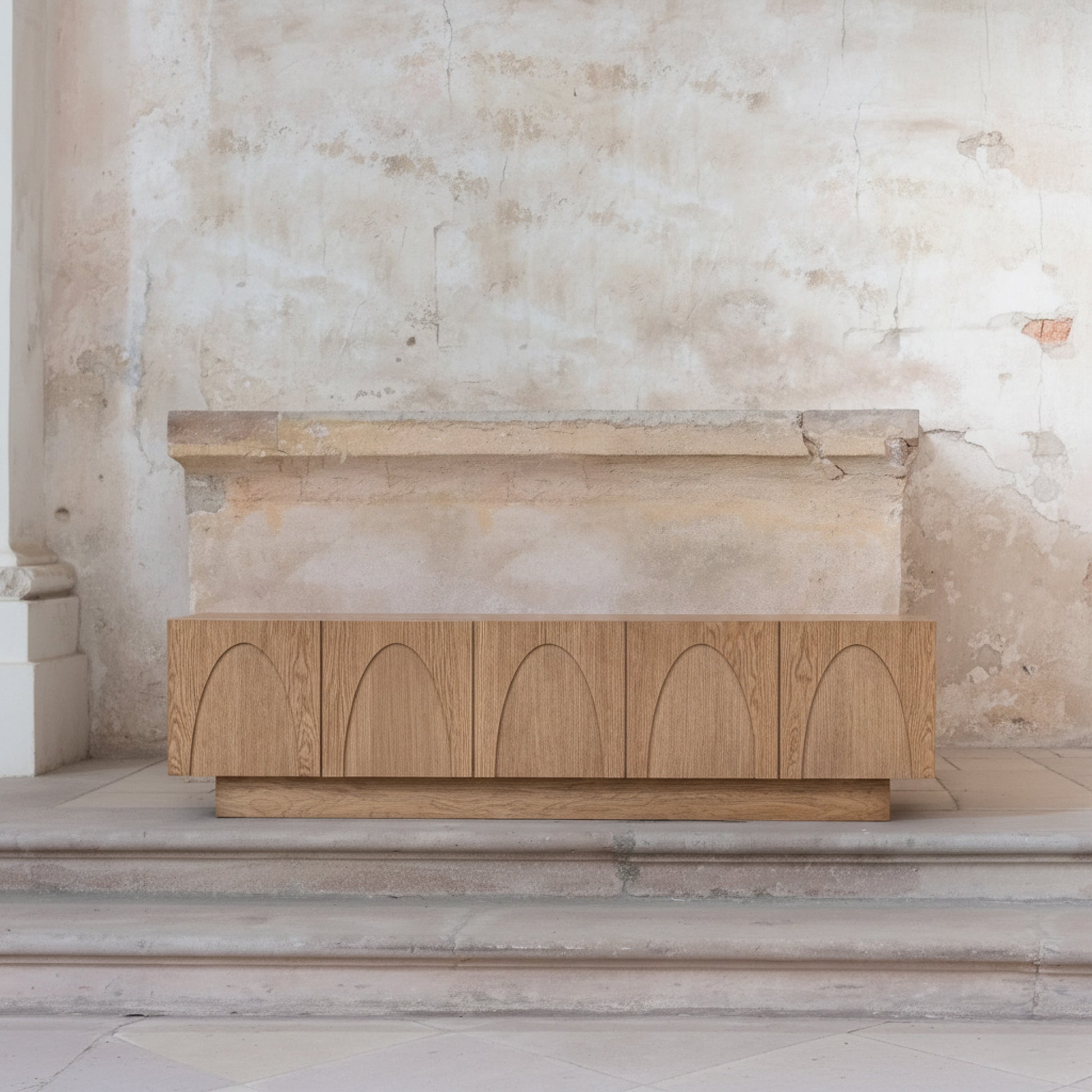 The BROK sideboard captures the eye with a gentle, wave-like curve that flows across its front—like light and shadow dancing on the surface. Its clean yet expressive rhythm brings a quiet strength to any room, making it a natural anchor of calm and elegance.