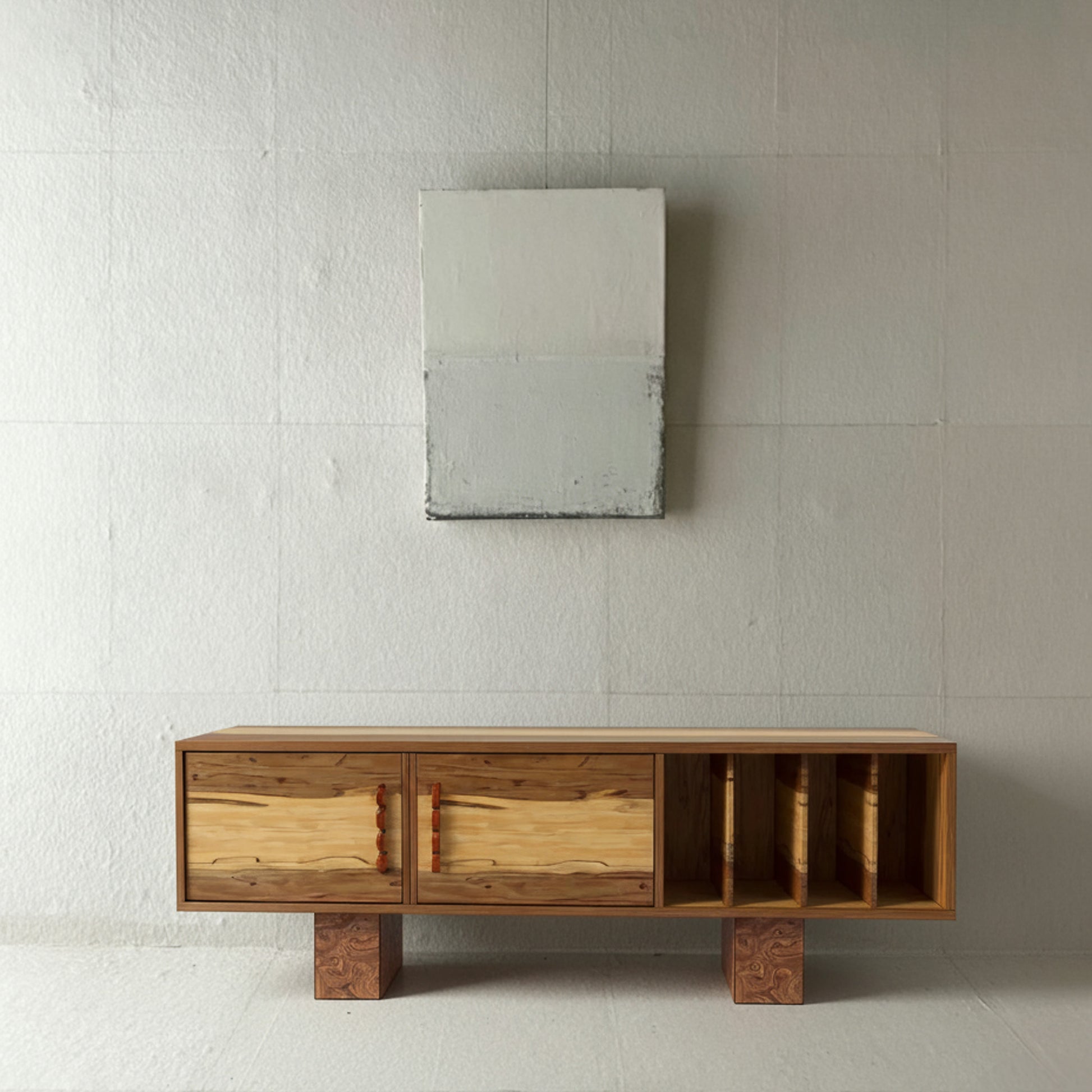 The open vertical compartments are perfect for displaying records, books, or décor, while the closed cabinet section keeps essentials tucked away. Resting on wide, block-like legs that ground the design, NAMI brings structure, warmth, and a sense of crafted authenticity to any interior.