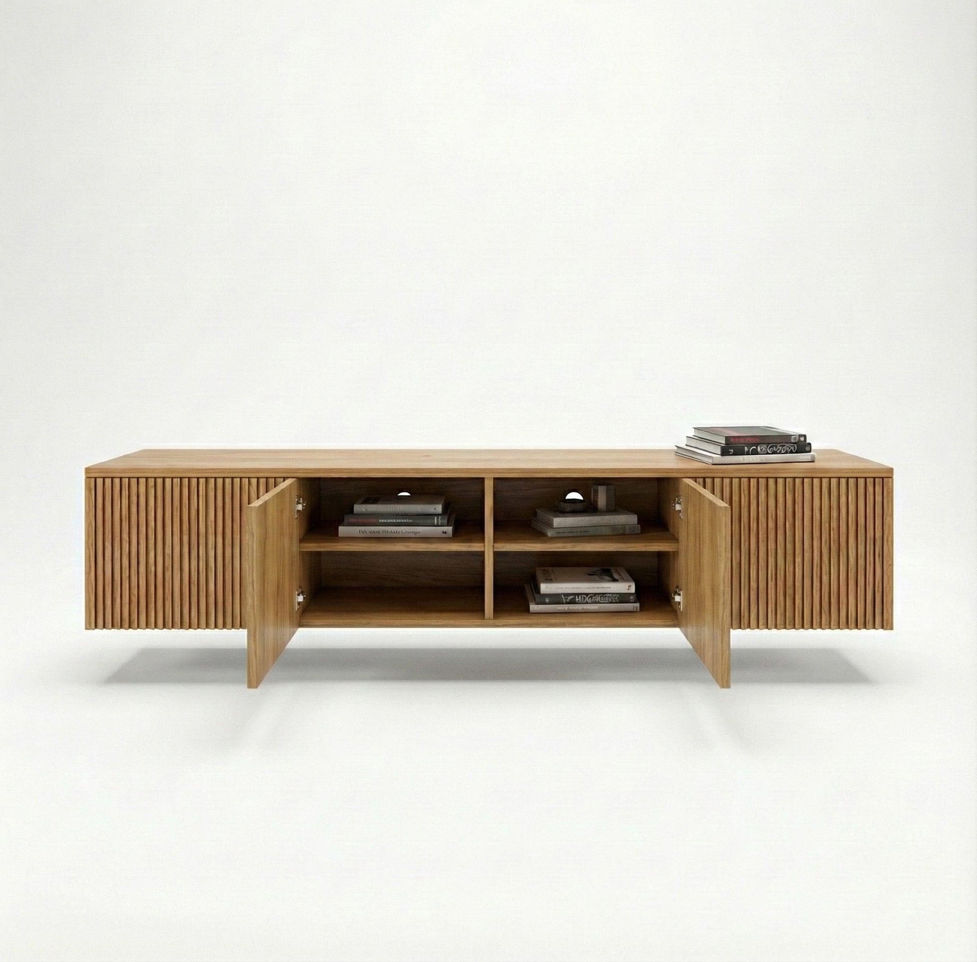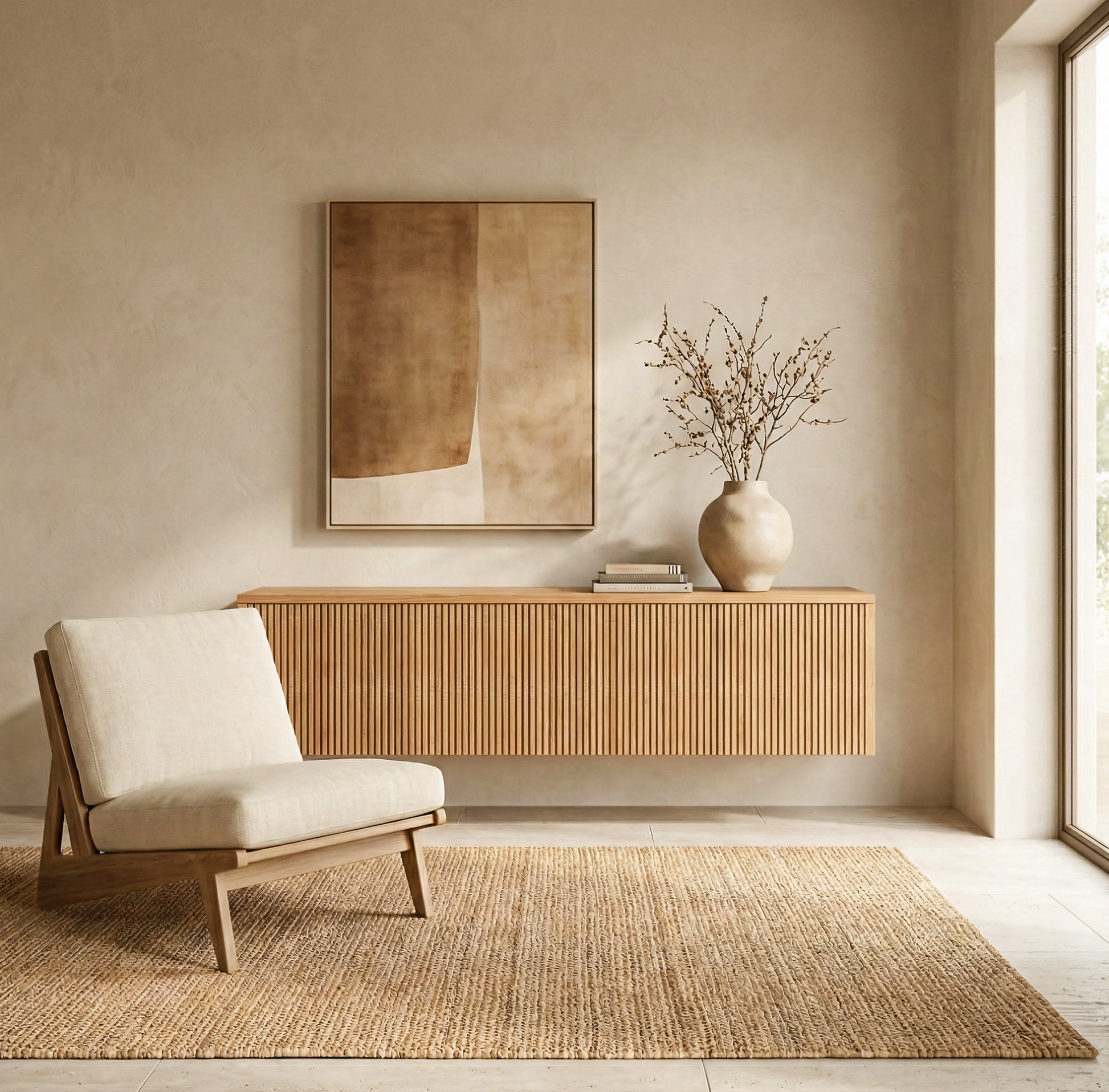 Zaprojektowana jako mebel podwieszany, lekko unosi się nad podłogą, wprowadzając do wnętrza poczucie lekkości i nowoczesnej elegancji. Naturalne wykończenie drewna dodaje ciepła i przyjemnej w dotyku faktury, a precyzyjne linie podkreślają wyrafinowaną, współczesną estetykę. To komoda stworzona, by dopełniać, a nie dominować — idealna do przestrzeni, w których spokój spotyka się z wyrafinowaniem.